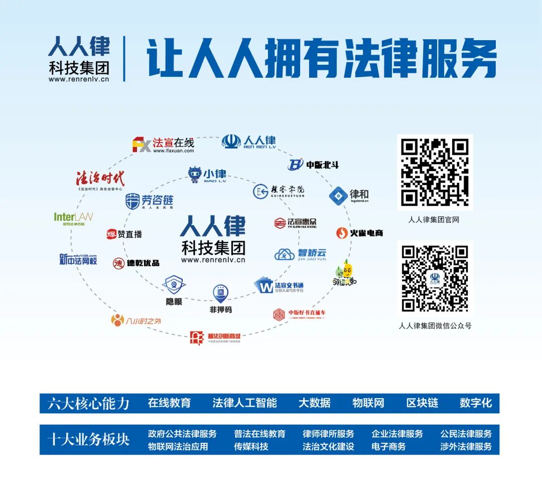 北京人人律科技集团有限公司(简称人人律科技集团或集团)于2022年10月登记成立。集团整合了法宣在线、人人律智能、中版北斗、《法治时代》杂志、劳咨链、惠众传媒、桂客学院、律和供应链、因特法务、德乾电商等十余家知名法律科技企业和新注册成立的40家省级全资子公司,现有法人企业50余家,正在继续吸收数家知名法律科技品牌加入。集团主要采用大数据、人工智能、区块链、物联网和数字出版等最新技术,重点面向数千万中小微企业和数亿中产阶级人群开展智慧学法用法和在线法律服务。计划3-5年时间内,实现集团年产值20亿元,净利润3亿多元的经营目标。集团目前是中国中小企业协会副会长单位,中国中小企业协会智慧法务分会的依托实体。